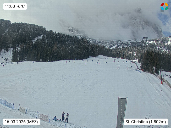 I 39047 Santa Cristina Gherdeina 1.430m, panoramic view from Mount Plan de Gralba 1.800m in south direction to the the skiing and hiking area Piz Sella and Mount Langkofel 3.181m in the valley Val Gardena. Presented by https://www.valgardena.it/.