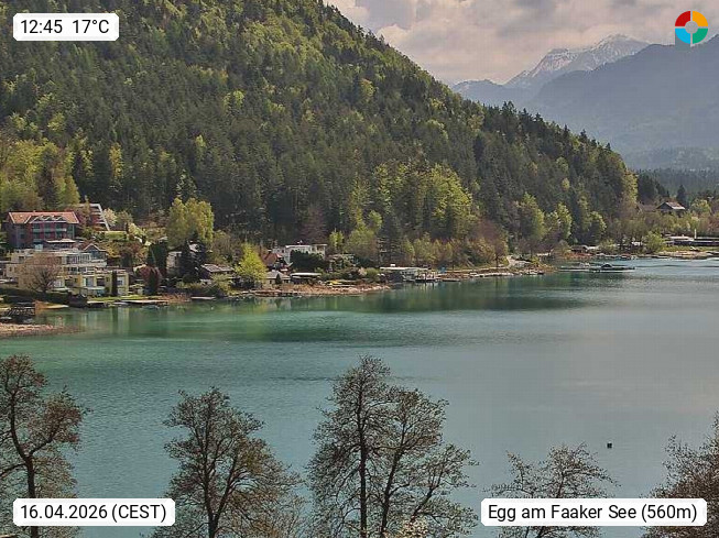 A 9580 Egg at Lake Faak 570m at the northern shore of the lake. View in east direction to the holiday resort Egg at Lake Faak 2,2 km², with Mount Tabor 725m. Presented by https://www.visitvillach.at/.