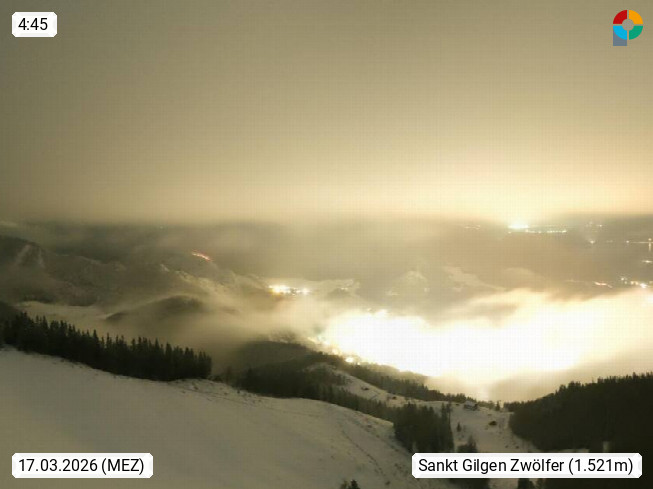 A 5340 Sankt Gilgen at Lake Wolfgangsee, panoramic view from the mountain station of Mount Zwoelferhorn cable cars 1.521m in northeast direction. Presented by https://wolfgangsee.salzkammergut.at.