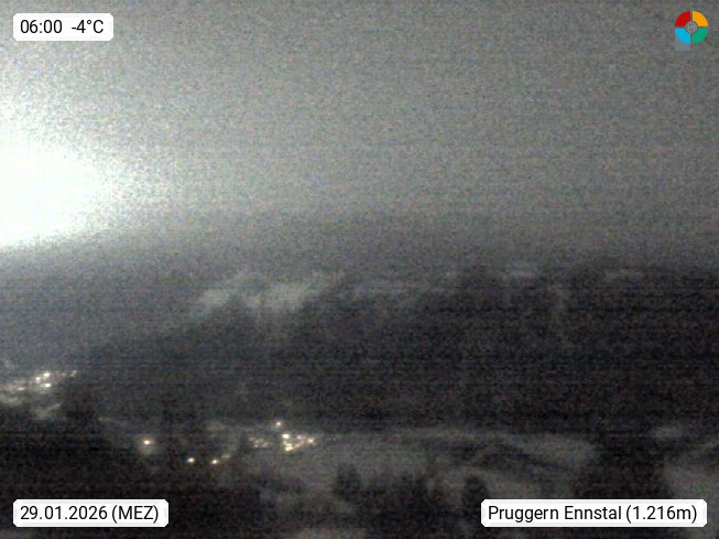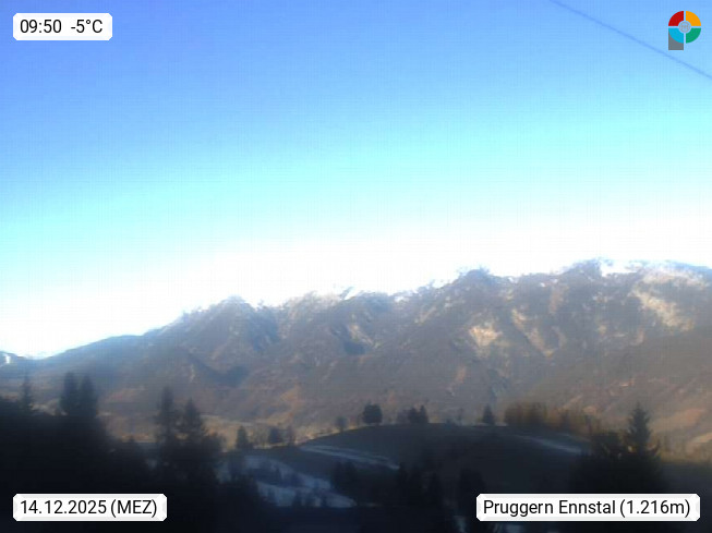 A 8965 Pruggern at Ennstal valley 690m, panoramic view from Huettendorf village in 1.200m in north direction over Ennstal valley to Mount Dachstein 2.995m. Presented by https://www.huettendorf-pruggern.com/.