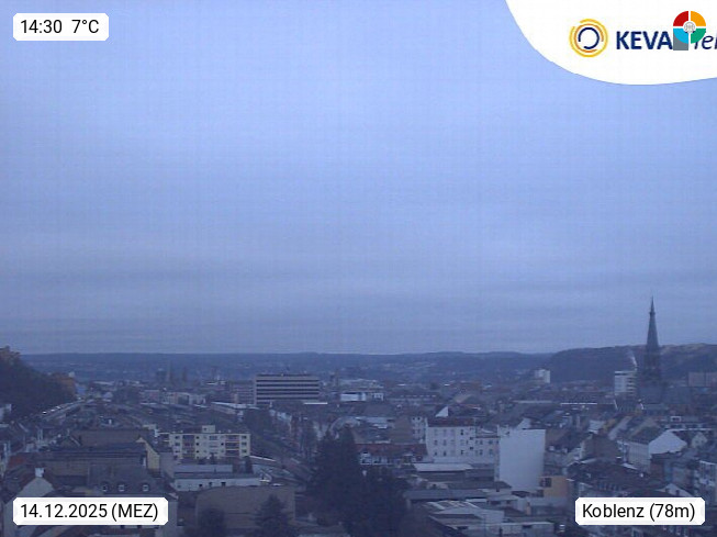 D 56068 Koblenz 60m, county-level city and one of the oldest cities in Germany at the mouth of the Moselle and Rhine in the so-called German Corner in northern Rheinland Pfalz. Panoramic view over the oldtown to the headland \"Deutsches Eck\" and the Fortress Ehrenbreitstein. Presented by https://www.sparkasse-koblenz.de/de/home.html.
