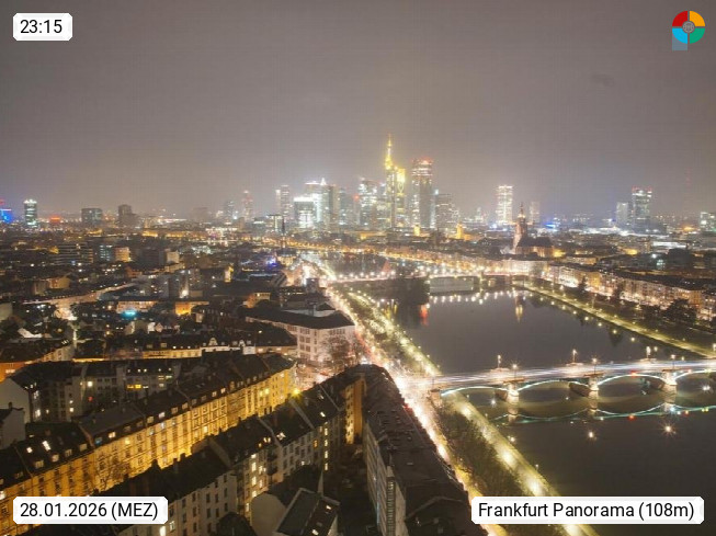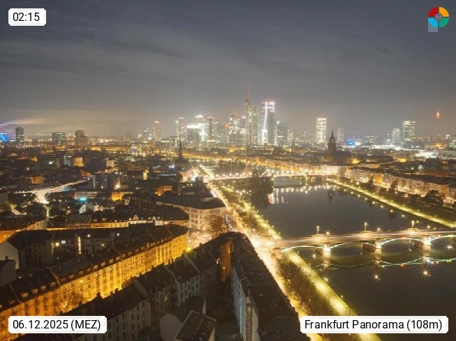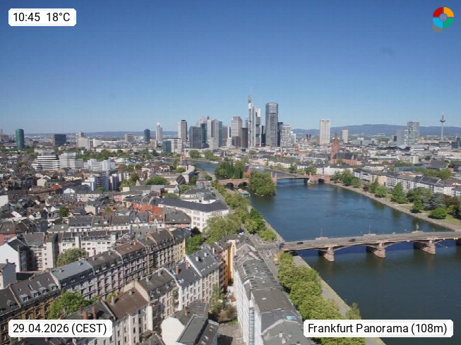 D 60327 Frankfurt on Main 112m, largest city in the German state Hesse and one of the richest cities in Europe as well as a metropole in the financial sector and literary and cultural field. The city lies on both sides of Main river southeast of Taunus mountains and is the birthplace of Johan Wolfgang von Goethe. Panoramic view from the roof of the gate lodge of the convention centre in south direction to the office buildings of the bank metropolis Frankfurt on Main. Presented by https://www.bergfex.de/.