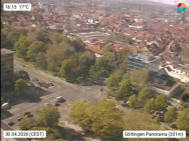 D 37083 Goettingen Goettingen 150m, University town in Lower Saxony, on the edge of the Goettingen forest. Panoramic view from the new town hall over the crossing \"Geismar Tor\". In the background is in the Sankt Jojannis and Sankt Jacobi Church. Presented by https://www.goecam.de/.