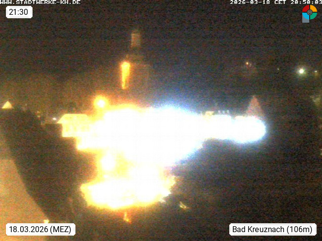55543 Bad Kreuznach 108m, Spa town and county town of the district of Bad Kreuznach. View over the river Nahe to the houses at the bridge. Presented by https://www.kreuznacherstadtwerke.de.