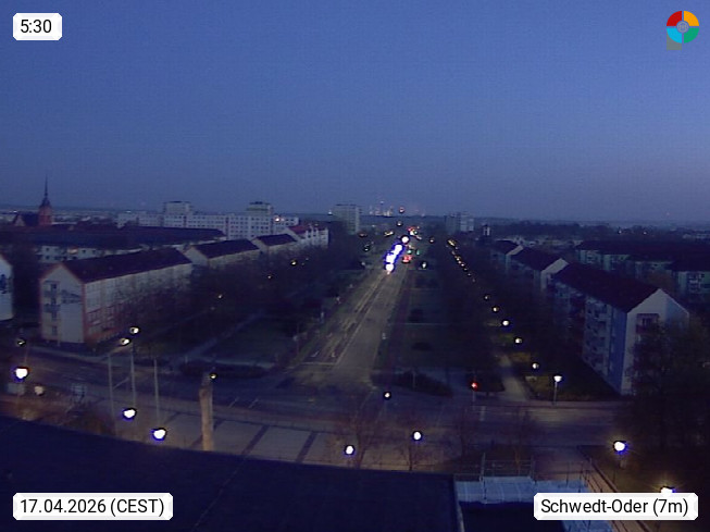D 16303 Schwedt an der Oder 8m, Town in the district Uckermark. Panoramic view from the House of the Uckermaerkischen Buehnen in north direction over the Lindenallee avenue to the Berlin Street. Presented by http://www.theater-schwedt.de.