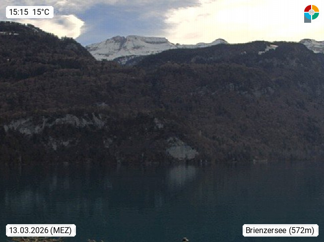 CH 3855 Brienz 566m, panoramic view from the Lake Promenade in south direction over Lake Brienz. Presented by http://www.webcam-brienzersee.com.