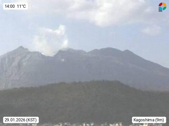 Kagoshima 8m, harbour town on the southwestern point of the island Kyushu. Panoramic view in east direction to the active volcano Sakura Jima 1.117 m. Presented by https://www.mbc.co.jp/.