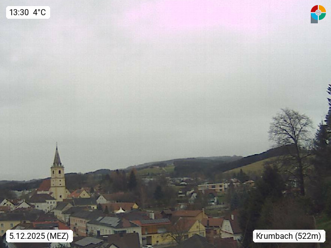 A 2851 Krumbach 540m, in the heart of the landscape Bucklige Welt. Panoramic view over the market town Krumbach with Marktstrasse street and the parish church Sankt Stephan. On the right Mount Kuehriegel 896m, the second largest elevation of the landscape Bucklige Welt, on the left Pass Weisses Kreuz 640m. Presented by https://www.tornados.at/.