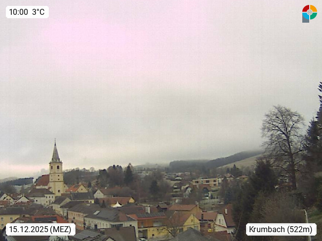 A 2851 Krumbach 540m, in the heart of the landscape Bucklige Welt. Panoramic view over the market town Krumbach with Marktstrasse street and the parish church Sankt Stephan. On the right Mount Kuehriegel 896m, the second largest elevation of the landscape Bucklige Welt, on the left Pass Weisses Kreuz 640m. Presented by https://www.tornados.at/.