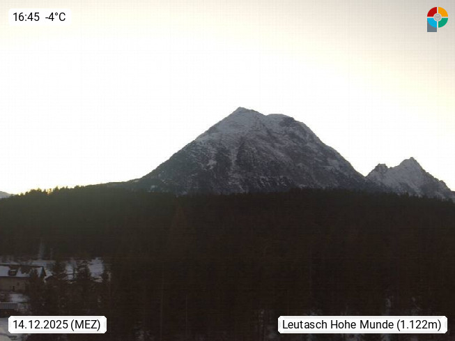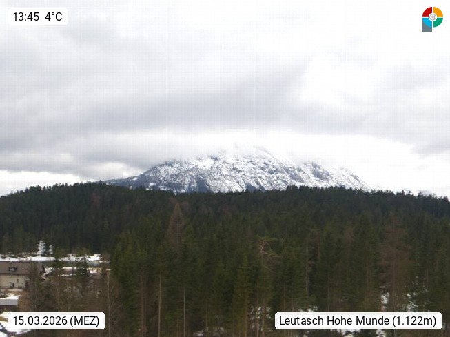 A 6105 Leutasch 1.136m, upper valley near Wettersteingebirge mountains. Panoramic view from Hotel Hochland in west direction over the village district Weidach to the peak of Mount Hohe Munde 2.662m and to the apartments House Schiefer. Presented by https://www.hotel-hochland.at/.
