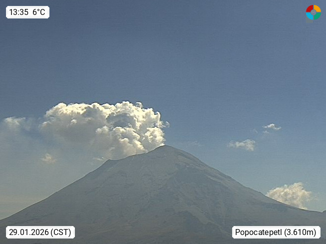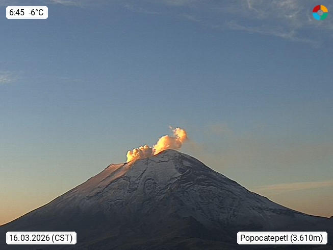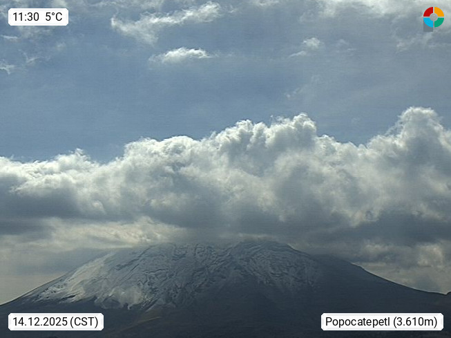Popocatepetl 5.462 meters also called El Popo or Don Goya, is one of the so called twin-volcanos in Central Mexico. Its little brother is the Iztaccihuatl with 5.286 meters. View from Paso de Cortez in south direction to the peak. Presented by https://webcamsdemexico.net.