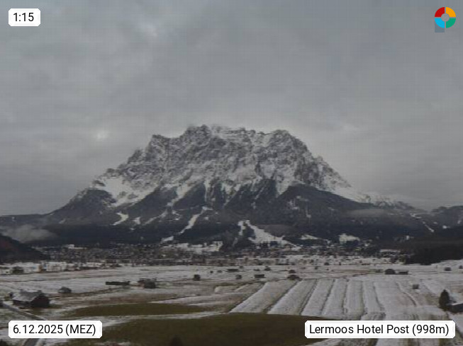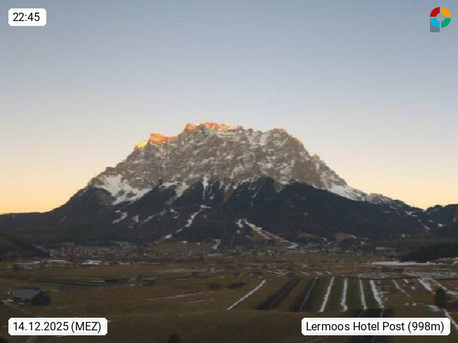 A 6631 Lermoos 1.010m, in the district Reutte in Ausserfern region between Lechtaler and Ammergauer Alps and the Wettersteingebirge mountains. View from Hotel Post over the sunterasse in northeast direction over the moss with the golf course Tiroler Zugspitz in the Zugspitz Arena. In the background the Zugspitze 2.962 meters, the highest mountain of Germany. Presented by https://www.post-lermoos.at/.
