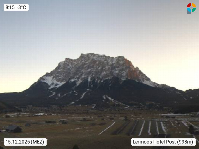 A 6631 Lermoos 1.010m, in the district Reutte in Ausserfern region between Lechtaler and Ammergauer Alps and the Wettersteingebirge mountains. View from Hotel Post over the sunterasse in northeast direction over the moss with the golf course Tiroler Zugspitz in the Zugspitz Arena. In the background the Zugspitze 2.962 meters, the highest mountain of Germany. Presented by https://www.post-lermoos.at/.