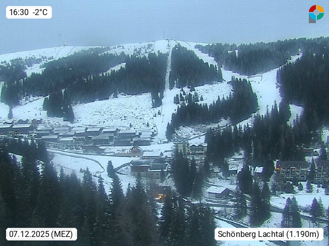 A 8831 Schönberg Lachtal 1.035m at the mountain Woelzer Tauern in district Murau. View from Lachtalhouse 1.600m over the Kinder Lachtal in east direction to the Lachtal chairlift for 6 persons. In the background on the right side you can see the Schönberglift. 1.940m and left side of the Tanzstattlift 1950m. Presented by https://www.lachtal.at/.