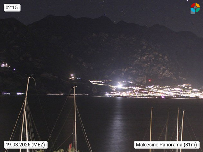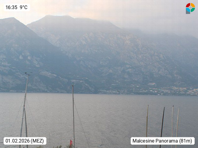 I 37018 Malcesine 89m, at the eastern shore of Lake Garda in the Province Verona in region Veneto. Malcesine is known as one of the most beautiful villages at the lake and is therefore also called \"Pearl of Lake Garda\". Panoramic view from the roof terace of Villa Orizzonte in southwest direction onto the Lake Garda. Presented by https://stickl.com/.