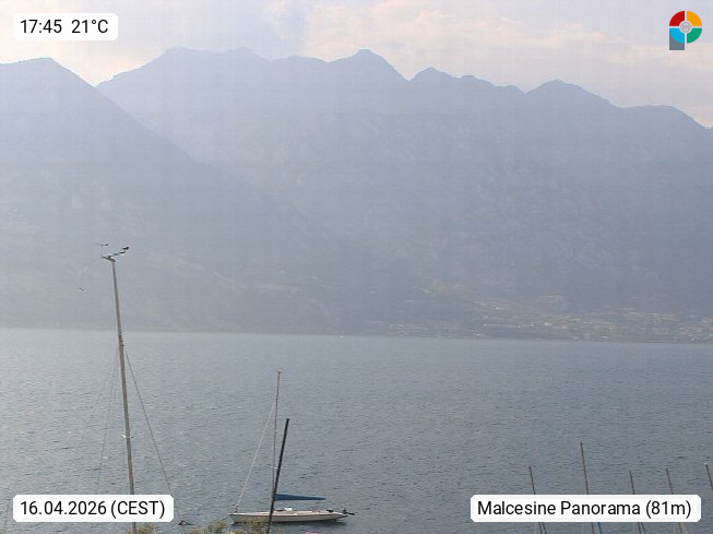 I 37018 Malcesine 89m, at the eastern shore of Lake Garda in the Province Verona in region Veneto. Malcesine is known as one of the most beautiful villages at the lake and is therefore also called \"Pearl of Lake Garda\". Panoramic view from the roof terace of Villa Orizzonte in southwest direction onto the Lake Garda. Presented by https://stickl.com/.