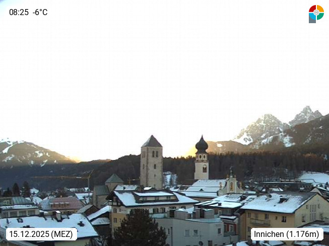 I 39038 Innichen (San Candido) 1.175m on Drau River in Puster Valley on the border to East-Tyrol (Tirolo Oriejntale) in Austria. View from Sportshotel Tyrol in the village center with the romantic collegiate church in east direction to Helmplateau 2.050m on Helm (Monte Elmo) 2.434m. Presented by https://www.sporthoteltyrol.it/de/4-sterne-superior-hotel-innichen.html.