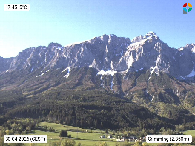 A 8960 Niederoeblarn 679m, in the upper Ennstal in Liezen. View from the roof of the company building of the Union Sports Club Niederöblarn east to the south side of the Grimming 2.351m, an isolated massif of the Dachstein mountain range at the transition from the Salzkammergut in the Ennstal. Presented by https://www.sportsarea.at/.