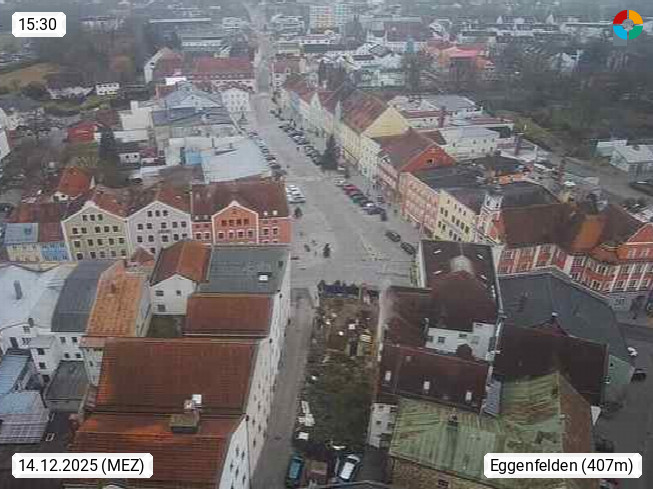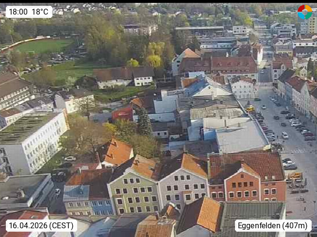 D 84307 Eggenfelden 416m, town in the Rott valley. View from the tower of the town church in southern direction over the town square. Presented by https://www.eggenfelden.de/de/.
