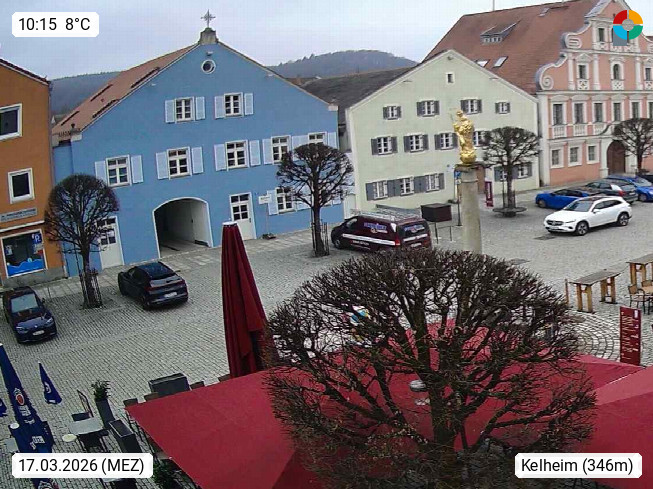 D 93309 Kelheim 343m, county seat at the output of the Danube breakthrough below the Michelmountain at the mouth of Altmühl into the Danube. Overlooking the town square to the west. Presented by https://www.kelheim.de/.