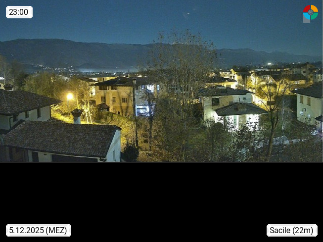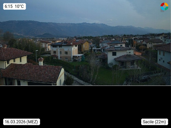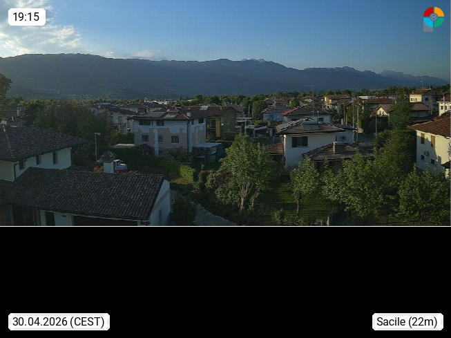I 33077 Sacile 27m on the river Livenza, town west of Pordenone, which is often, referred to its many channels, called Little Venice. Panoramic view from the city center to the west. Presented by http://www.sacilemeteo.it.