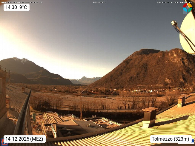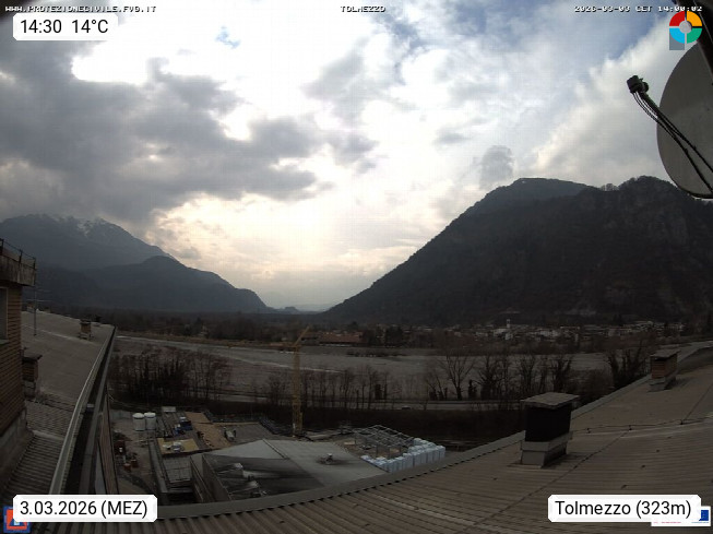 I 33028 Tolmezzo 323m, on Tagliamento river in Friuli and capital of the historic region of Carnia. Panoramic view over the Tagliamento, left the Mount Verzegnis, the valley of Tagliament with the village Ampezzo. In the foreground the city Caneva. Presented by https://www.meteo.fvg.it/.