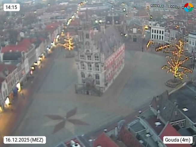 NL 2800 Gouda 25m,city at the confluence of IJssel and Gouwe and world famous for the eponymous Gouda cheese. View over the market square with Gothic town hall in the old town of Gouda. Presented by https://www.gouda.nl/.