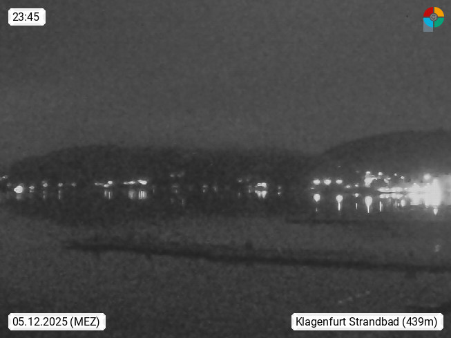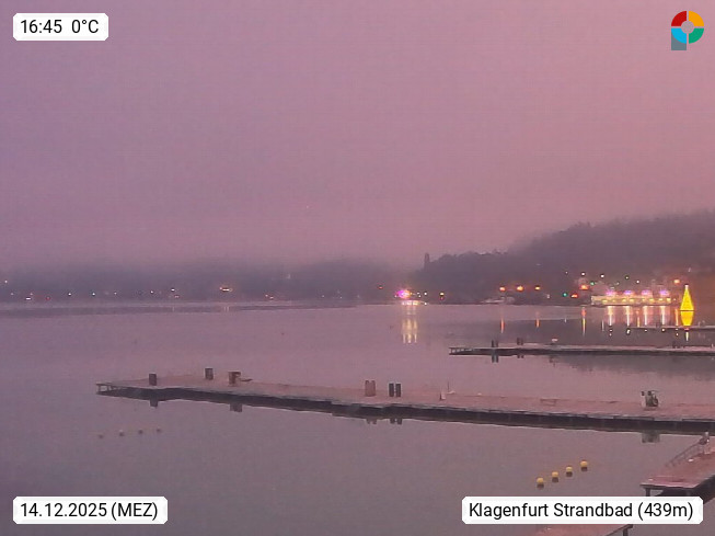 A 9020 Klagenfurt at Woerthersee 445m, capital of the state Carinthia at the eastern shore of Lake Woerthersee in the Klagenfurt basin. View from the beach of Klagenfurt, the largest inland lido in Europe, which has been opened in 1924. View in north direction to the jetties and the beach. Presented by https://www.klagenfurt.at:443/.