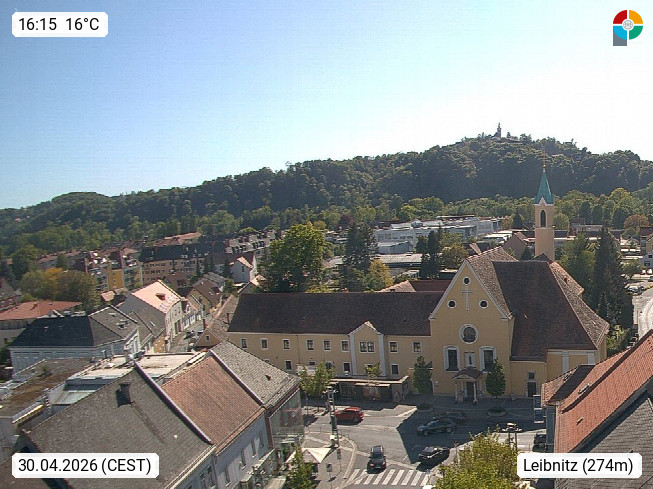 A 8430 Leibnitz 275m, capital in Southern Styria, between the rivers Mur and Sulm in Leibnitzer Feld. View from the tower of the town hall on the main square to the west. Presented by https://leibnitz.info/de.