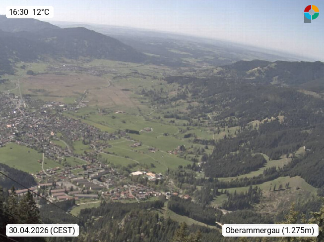 D 82487 Oberammergau 840m, community in the Ammer valley in the district of Garmisch-Partenkirchen on the river Ammer. View from the summit station on the Laber 1.683m north direction over the town of Oberammergau. Every ten years in Oberammergau Passion Play will be held, last in 2010. Presented by https://www.laber-bergbahn.de/.