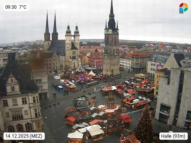 D 06100 Halle on Saale 88m, county-level city in the south of Saxony-Anhalt and the seat of the provincial administration office. View from Ratshof to the market square of city hall with town house, market church and Red Tower 84m, the symbol of the town Halle, also called city of the five towers. Presented by https://www.halle.de/de/startseite/index.aspx.