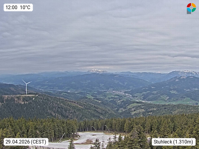 A 8684 Spital 800m, on the Styrian side of the Semmering Pass in District MĂĽrzzuschlag. Panoramic view from the restaurant at the top station in the 1.643m Stuhleck, northeast of Semmering and Vienna Basin. Presented by https://www.stuhleck.at/.