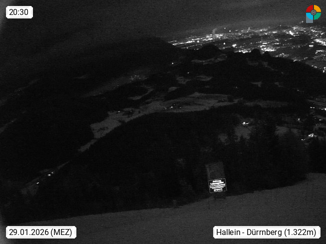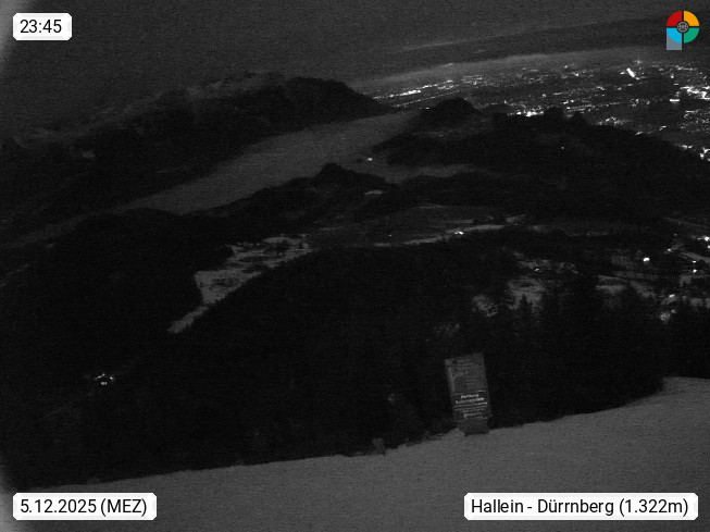 Bad Duerrnberg 780m, community part of the town Hallein on Duerrnberg, west of the town. Panoramic view from the mountainstation of Zinkenlift 1.330m to Salzachtal and the city Salzburg. Presented by https://xn--zinkenstberl-klb.at/.