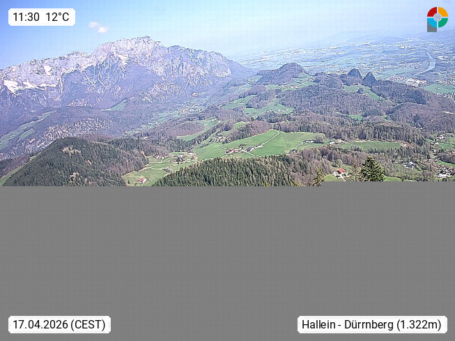 Bad Duerrnberg 780m, community part of the town Hallein on Duerrnberg, west of the town. Panoramic view from the mountainstation of Zinkenlift 1.330m to Salzachtal and the city Salzburg. Presented by https://xn--zinkenstberl-klb.at/.