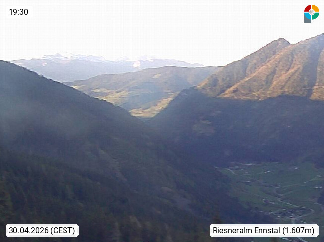A 8953 Donnerbachforest 960m, in the Lower Tauern in canton Liezen. View from the mountain station to the Hochsitz 1.920m in northeast direction over the long drawn-out basin of the Donnersbachvalley to the Ennsvalley. Presented by https://www.riesneralm.at/.