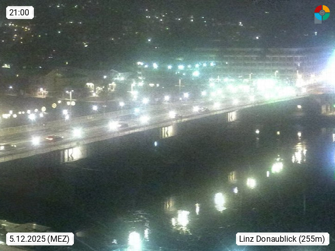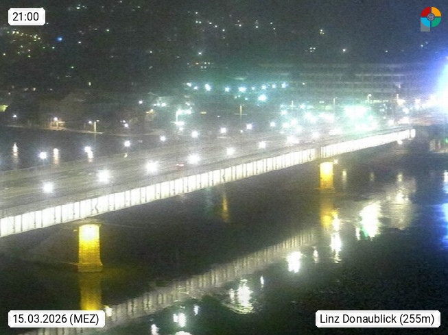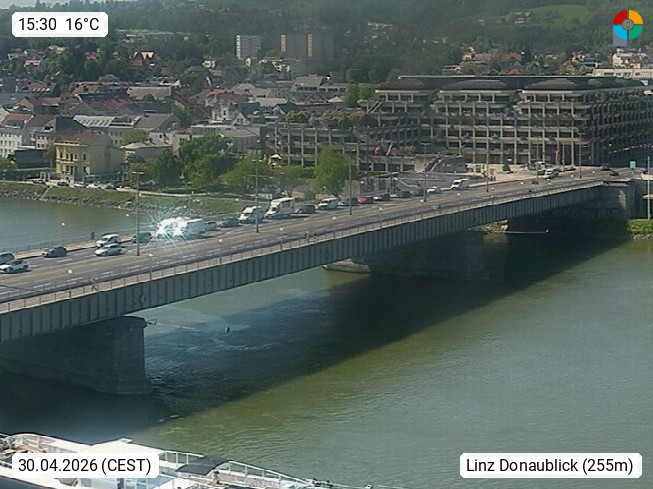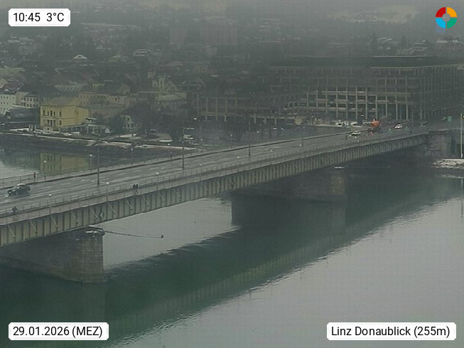 Linz 266m, Landeshauptstadt von Oberösterreich an der Donau. Panoramablick nach Osten auf die obere Donaulände und die Nibelungenbrücke sowie Alt-Urfahr. Im Hintergrund der Freinberg mit der Franz Josefs-Warte. Presented by https://www.linztourismus.at/.