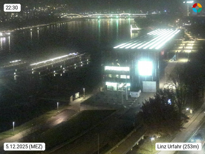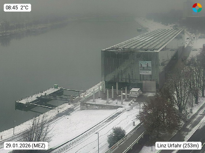 Linz 266m, Landeshauptstadt von Oberösterreich an der Donau. Panoramablick nach Osten auf die untere Donaulände mit dem Lentos Kunstmuseum und das Urfahraner Jahrmarktgelände. Im Hintergrund die 2016 stillgelegte Eisenbahnbrücke. Presented by https://www.linztourismus.at/.