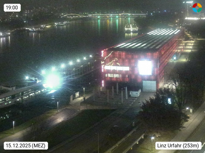 Linz 266m, Landeshauptstadt von Oberösterreich an der Donau. Panoramablick nach Osten auf die untere Donaulände mit dem Lentos Kunstmuseum und das Urfahraner Jahrmarktgelände. Im Hintergrund die 2016 stillgelegte Eisenbahnbrücke. Presented by https://www.linztourismus.at/.