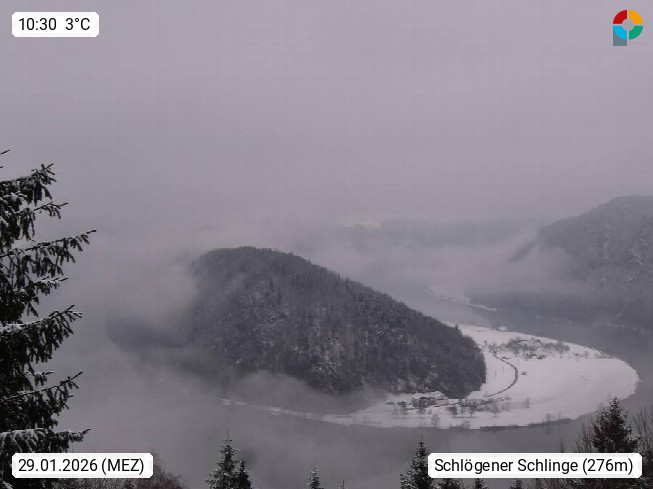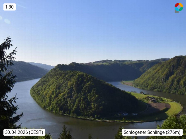 Haibach/Hofkirchen 276m, Blick auf die Schlögener Schlinge vom Schlögener Blick aus. Die Schlögener Schlinge – eine Flussschlinge der Donau – befindet sich zwischen Passau und Linz. Die Gemeinden Haibach ob der Donau (im Süden) sowie Hofkirchen im Mühlkreis und Niederkappel (beide im Norden) grenzen an die Schlögener Schlinge an, an der die Donau zweimal um 180 Grad wendet. Presented by https://www.donauregion.at/.
