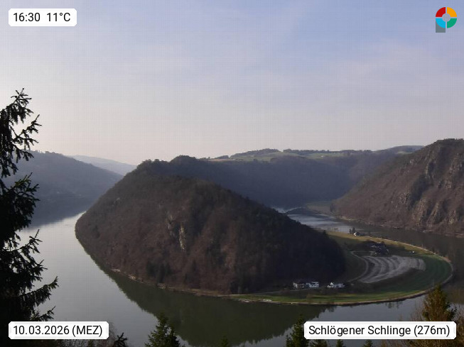Haibach/Hofkirchen 276m, Blick auf die Schlögener Schlinge vom Schlögener Blick aus. Die Schlögener Schlinge – eine Flussschlinge der Donau – befindet sich zwischen Passau und Linz. Die Gemeinden Haibach ob der Donau (im Süden) sowie Hofkirchen im Mühlkreis und Niederkappel (beide im Norden) grenzen an die Schlögener Schlinge an, an der die Donau zweimal um 180 Grad wendet. Presented by https://www.donauregion.at/.