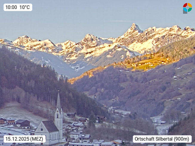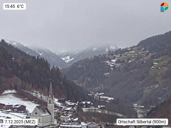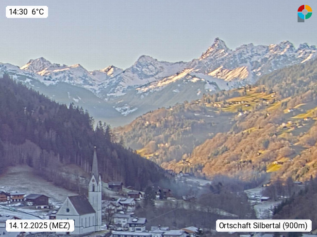 A 6782 Silbertal 900m, Bergdorf und ehemaliger Bergbauort (Kupfer und Silber) an der Litz in der Region Montafon im Bezirk Bludenz. Blick Richtung Westen, im Hintergrund die Zimba 2.643m. Presented by https://www.montafon.at/de/Mein-Montafon/Bergdoerfer/Silbertal.