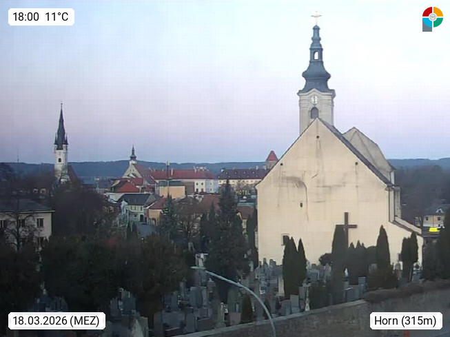 3580 Horn 320m, Bezirkshauptstadt an der Taffa im östlichen Waldviertel in Niederösterreich. Blick Richtung Osten zur Stephanskirche welche im 11. Jahrhundert als Wehrkirche errichtet wurde. Presented by https://www.netcamera.org/.