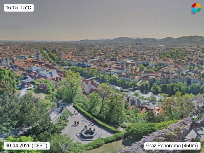 AT 8010 Graz Landeshauptstadt des Bundeslandes Steiermark an der Mur im Grazer Becken. Graz ist mit rund 300.000 einwohnern die zweitgrößte Stadt Österreichs. Panoramablick vom Schlossberg über den Süden von Graz. Presented by https://www.graz.at.