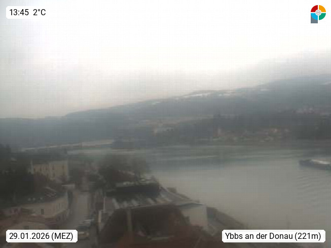 AT 3370 Ybbs an der Donau 223 m, Stadt im Mostviertel an der Donau gelegen im Berzik Melk. Blick donauaufwärts zum Kraftwerk und Schiff Schleuse Persenbeug. Presented by https://www.ybbs.gv.at.