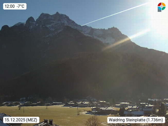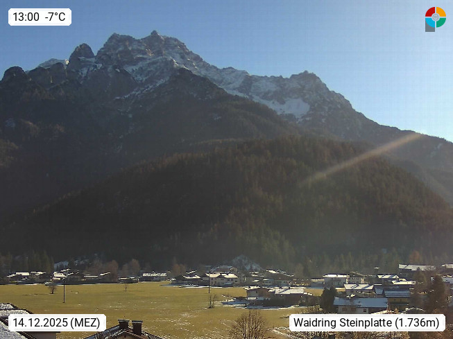 AT 6384 Waidring 780m, am Beginn des Pillersee Tal am Fuße der Loferer Steinberge im Dreiländereck Tirol - Bayern - Salzburg. Blick vom Ort Richtung Norden zur Steinplatte 1.869m in den Chiemgauer Alpen. An der Nordseite befindet sich das Familienskigebiet Steinplatte - Winklmoosalm welches von Waidring mit einer Godelbahn erschlossen ist. Presented by https://www.tiroler-adler.at/.