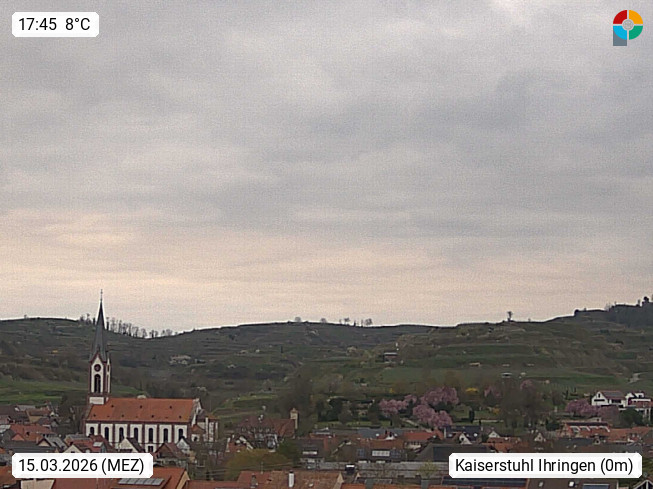 D 79241 Ihringen 202m, liegt im Landkreis Breisgau Hochschwarzwald, im Südwesten Baden Württembergs am Südhang des Kaiserstuhls. Ihringen ist bekannt als Weinanbauort und als "wärmster Ort Deutschlands". Panoramablick über die Stadt Richtung Westen. Presented by https://www.ihringen.de/start.