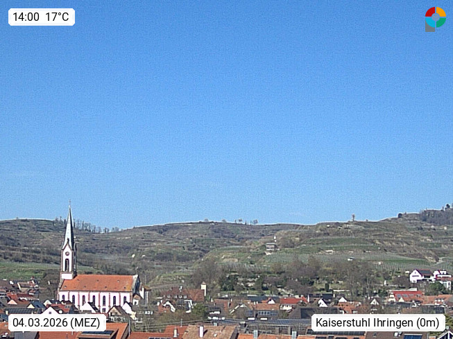 D 79241 Ihringen 202m, liegt im Landkreis Breisgau Hochschwarzwald, im Südwesten Baden Württembergs am Südhang des Kaiserstuhls. Ihringen ist bekannt als Weinanbauort und als "wärmster Ort Deutschlands". Panoramablick über die Stadt Richtung Westen. Presented by https://www.ihringen.de/start.