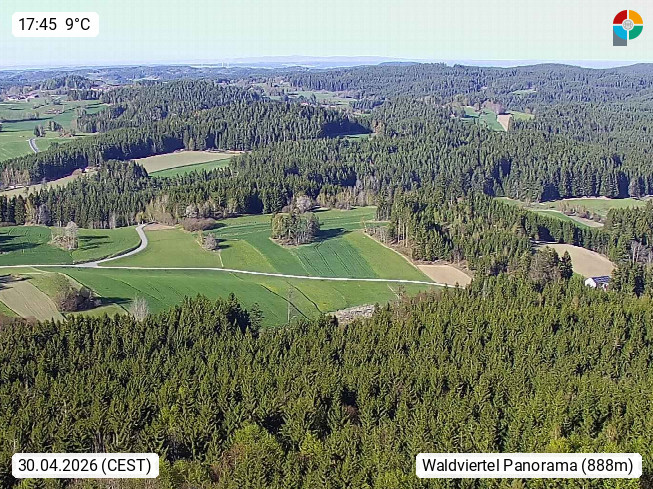 3920 Arbesbach 850m, Panorama über Teile des Waldviertels, im Mittelalter als "Viertel ober dem Manhartsberg" benannt und geografisch der nordwestliche Teil des österreichischen Bundeslandes Niederösterreich. Webcamservice von www.waldsoft.com. Presented by https://www.waldviertel.info.