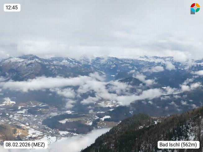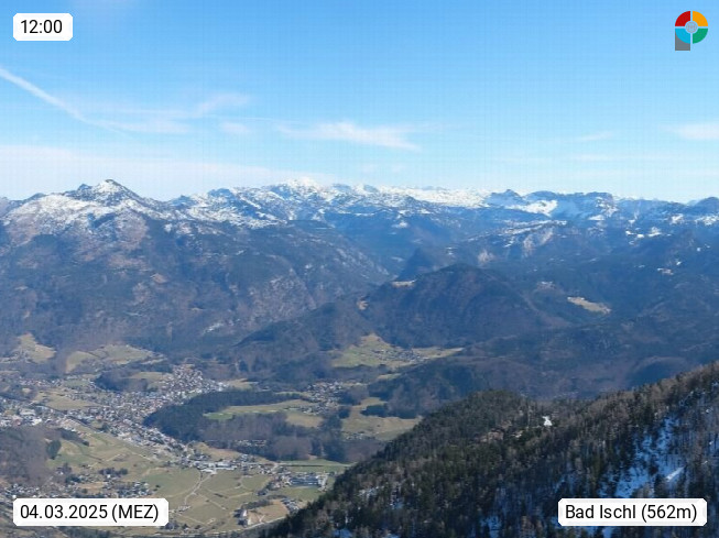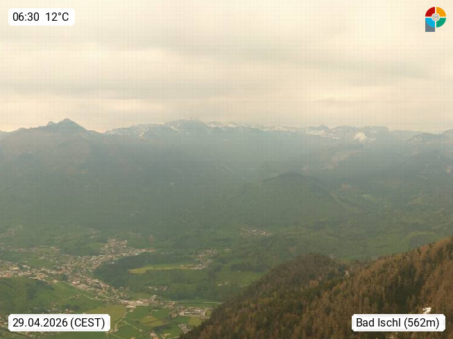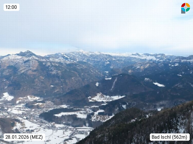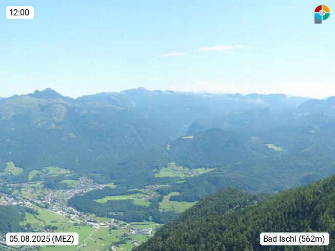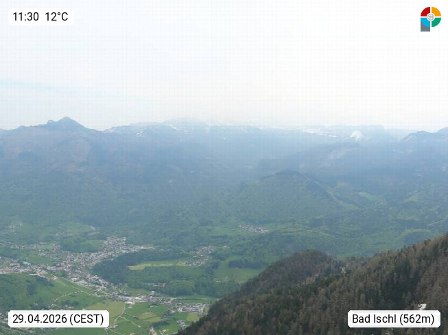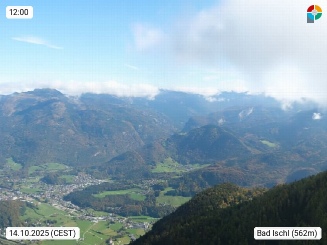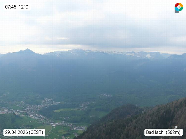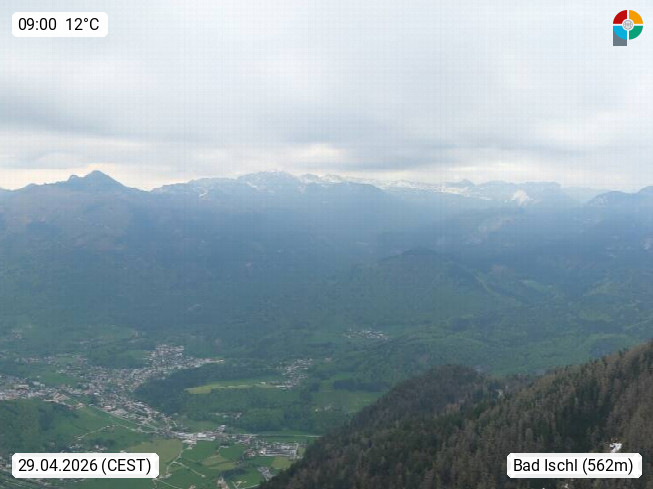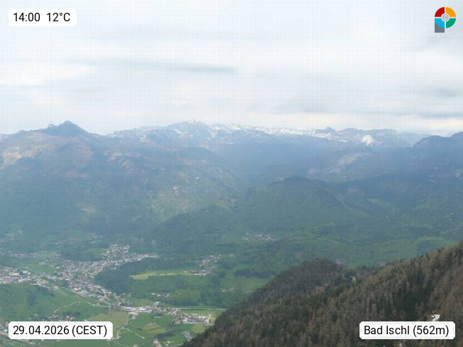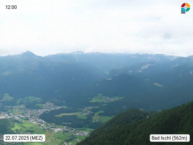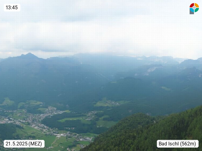 A 4820 Bad Ischl 468m, health resort in the centre of the region Salzkammergut at the river Traun in the south of Upper Austria. Panoramic view from the mountain station of Katrinseilbahn cable cars 1.418m in north direction over the Emperor Town Bad Ischl. On the left Mount Hoellkogel 1.862m, in the middle Mount Traunstein 1.691m and Lake Traunsee, on the right Mount Hohe Schrott 1.839m. Presented by https://badischl.salzkammergut.at.