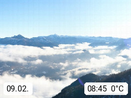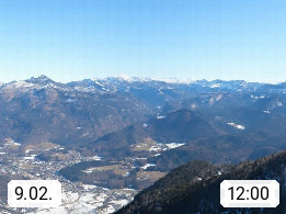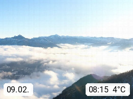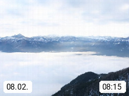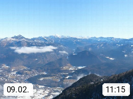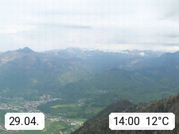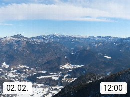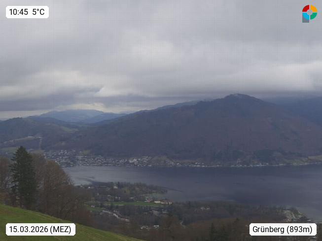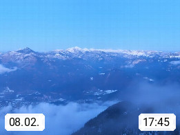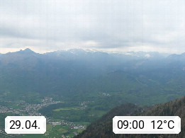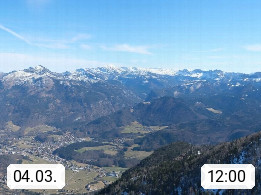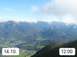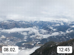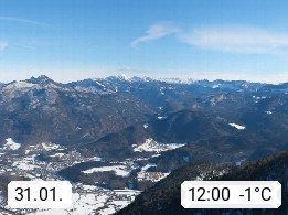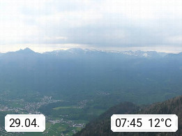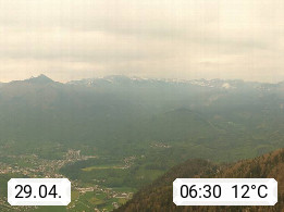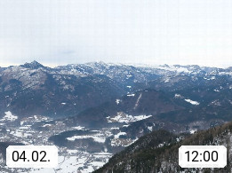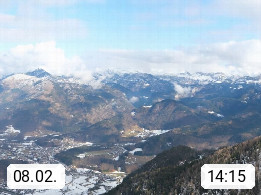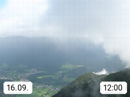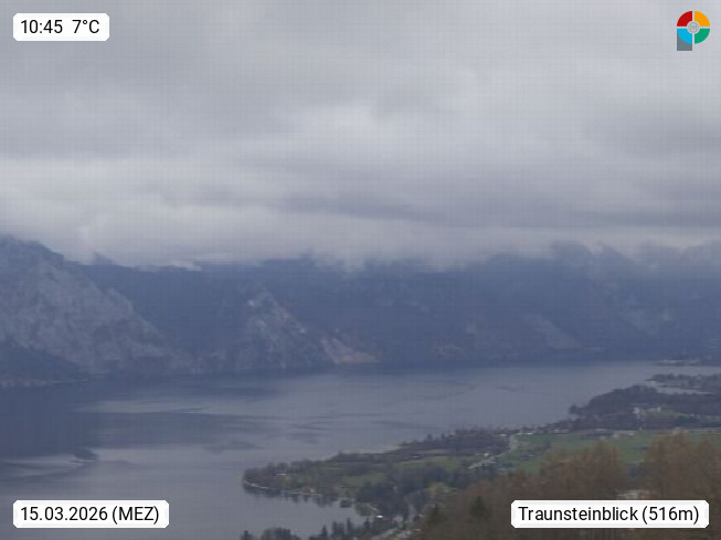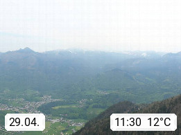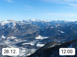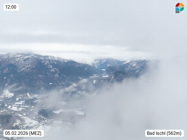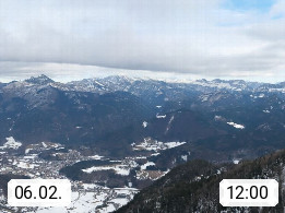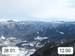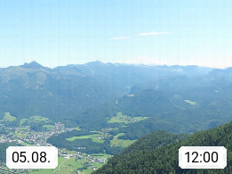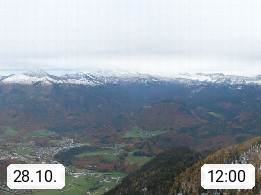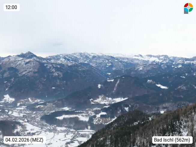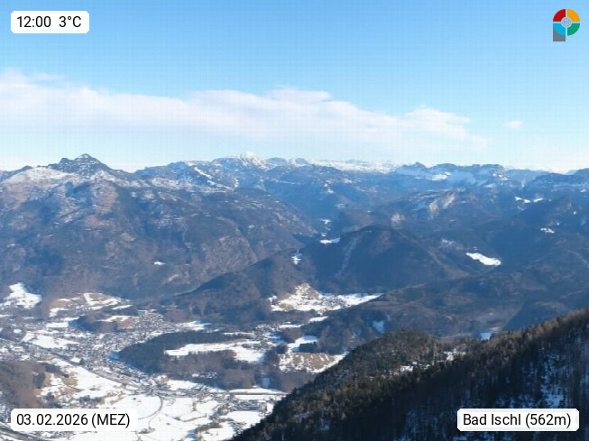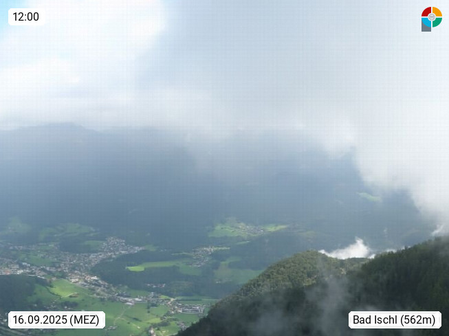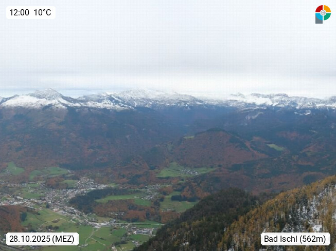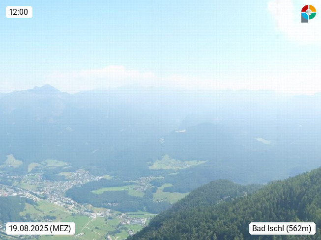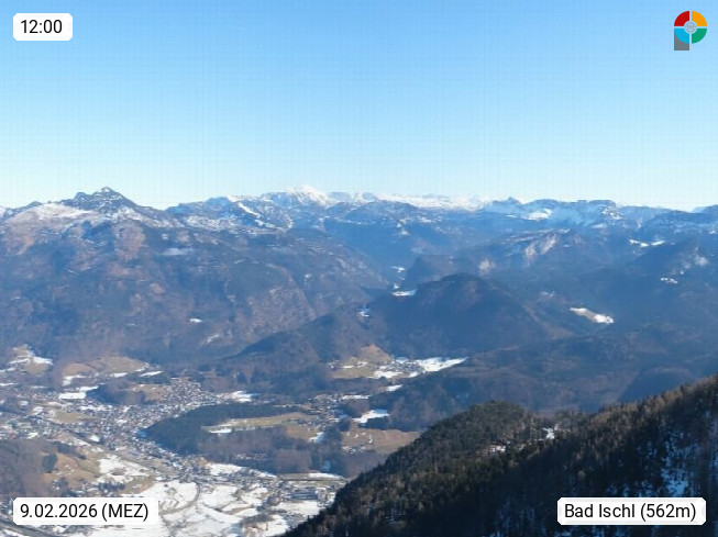 A 4820 Bad Ischl 468m, health resort in the centre of the region Salzkammergut at the river Traun in the south of Upper Austria. Panoramic view from the mountain station of Katrinseilbahn cable cars 1.418m in north direction over the Emperor Town Bad Ischl. On the left Mount Hoellkogel 1.862m, in the middle Mount Traunstein 1.691m and Lake Traunsee, on the right Mount Hohe Schrott 1.839m. Presented by https://badischl.salzkammergut.at.